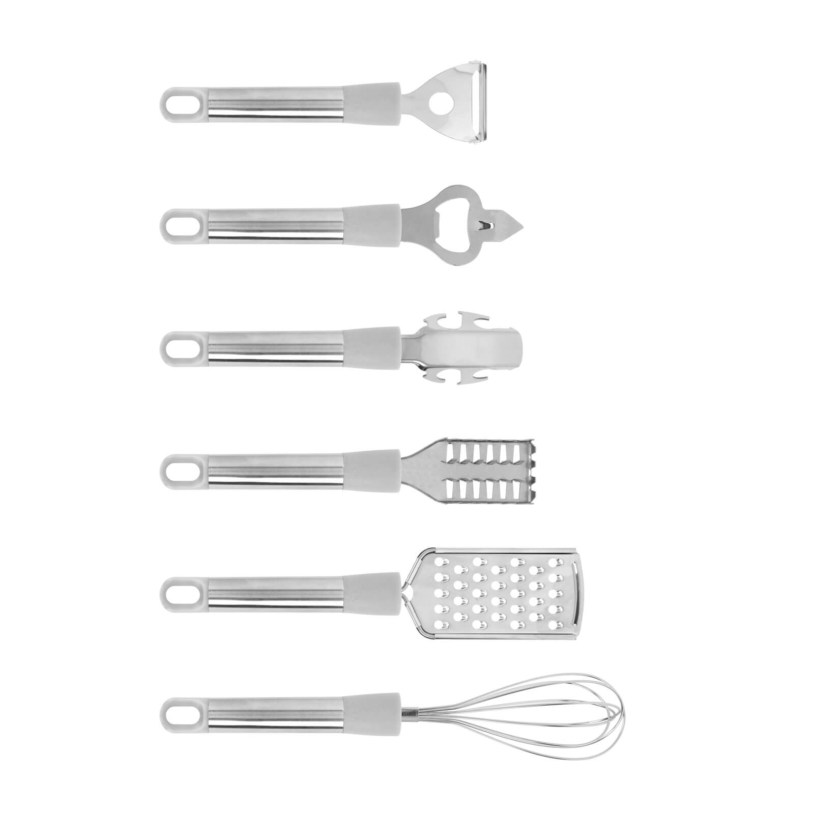 • Rozsdamentes acél nyéllel rendelkező konyhai eszköz szett. Helytakarékosan, könnyen áttekinthetően tárolhatja a mindennapi használati eszközeit. A főzés szinte minden területét lefedő készletben talál többek között habverőt, sajtreszelőt, zöldséghámozót, halpikkely eltávolító eszközt, sörbontót, konzervbontót is.