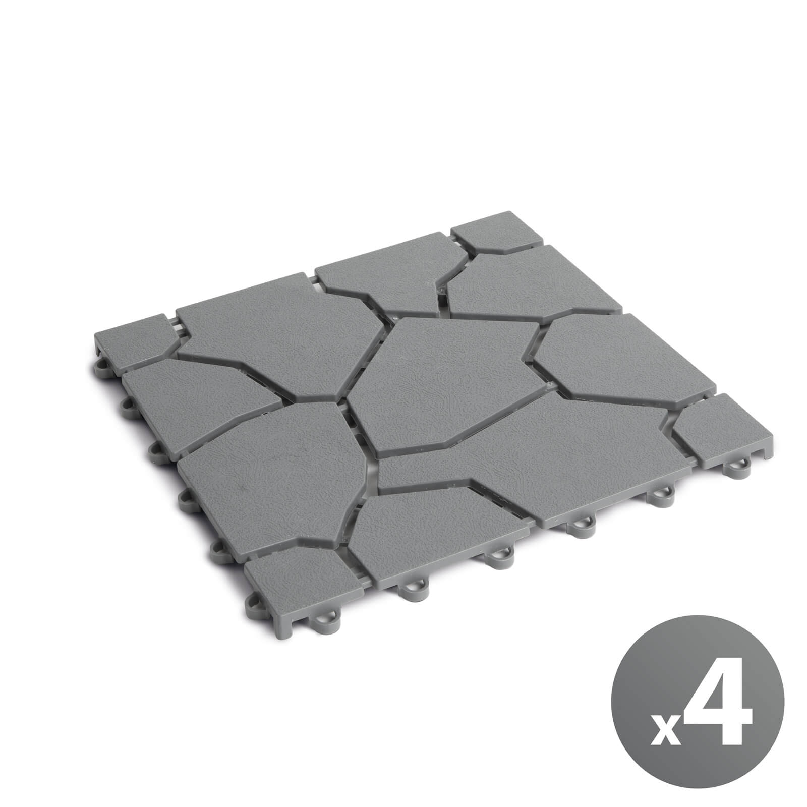 - Strapabíró műanyagból készült kőhatású kerti padlólap, amely ideális lehet teraszok, grillhelyek, kerti ösvények, verandák burkolására. A kőhatású design jól illeszkedik bármelyik kertbe, természetbe. Időjárásálló anyagának köszönhetően az év bármely napján használhatja, nem szükséges felszedni rosszidő esetén. A felületén lévő lyukak lehetővé teszik, hogy a víz át tudjon rajta folyni, így nem alakulnak ki pocsolyák. A klikkes rendszernek köszönhetően könnyen és gyorsan egymáshoz kapcsolhatóak az elemek, így lerakása egyszerűen megoldható.