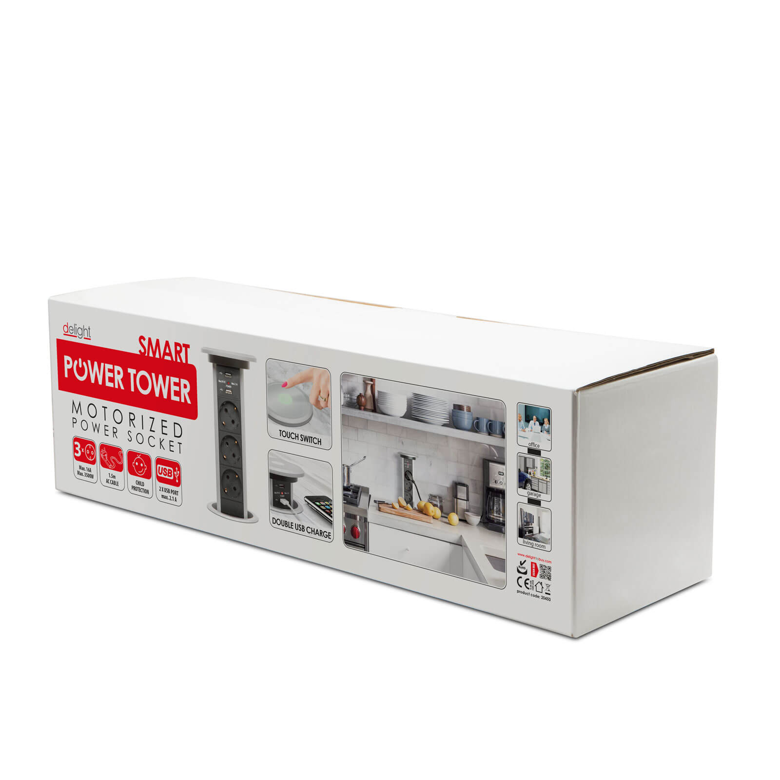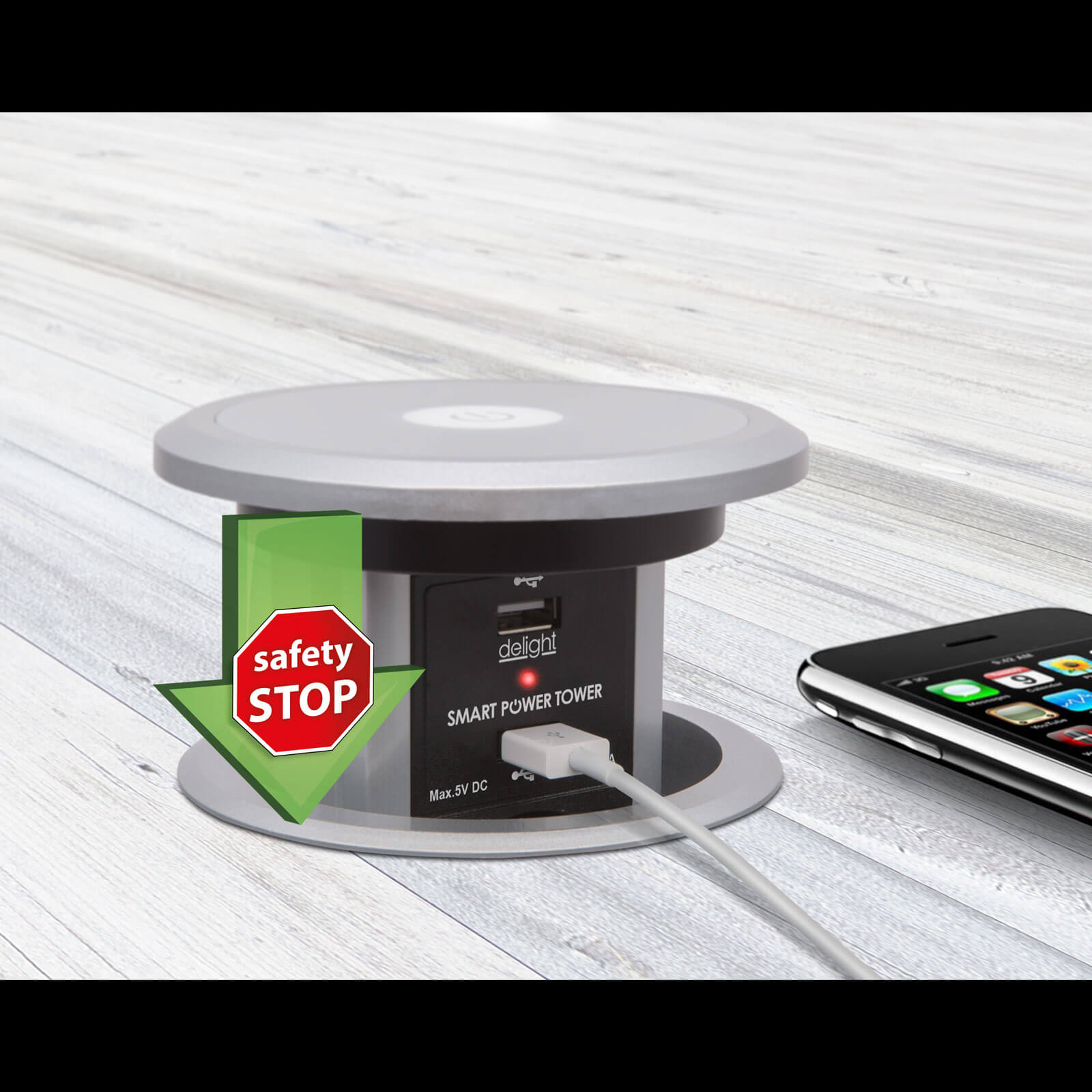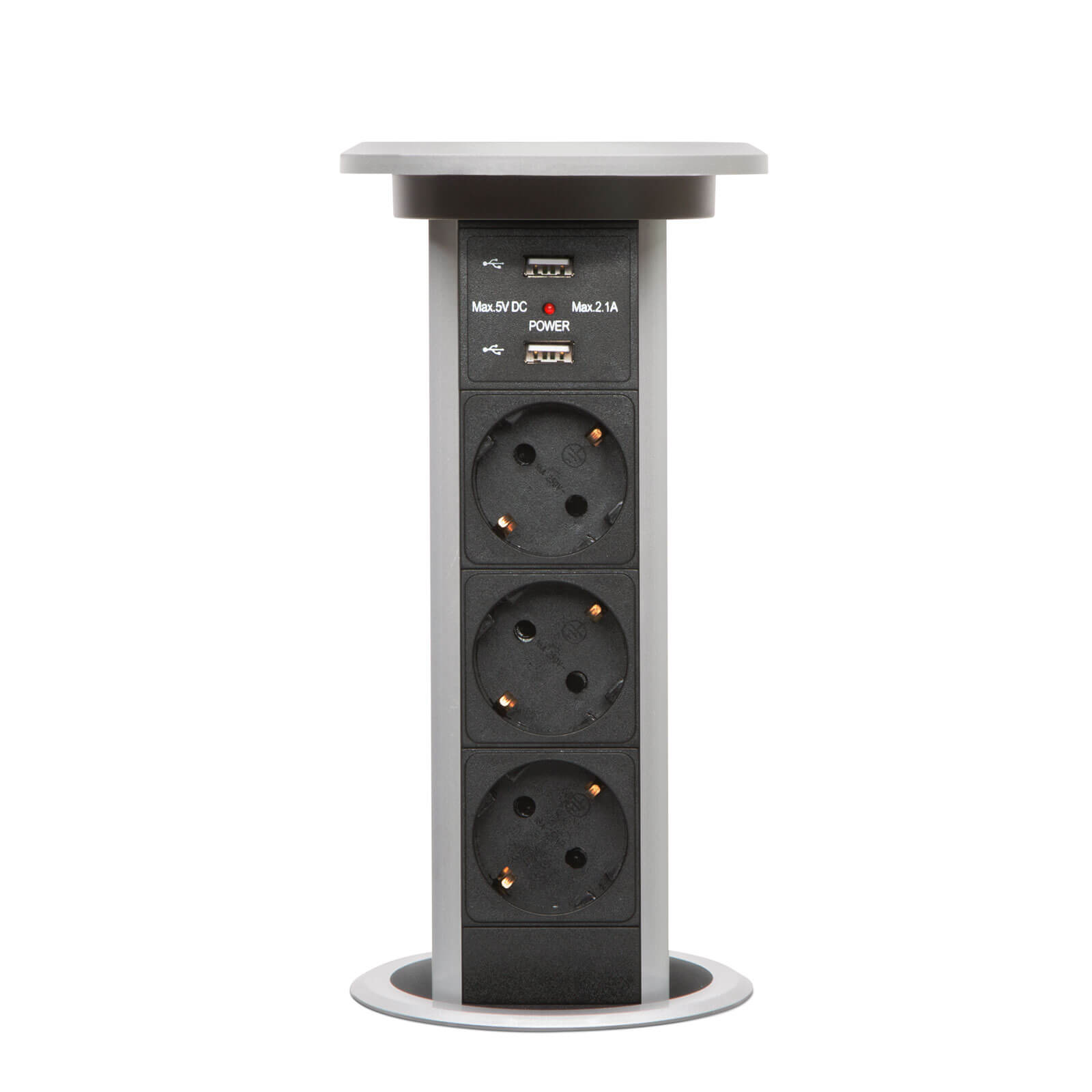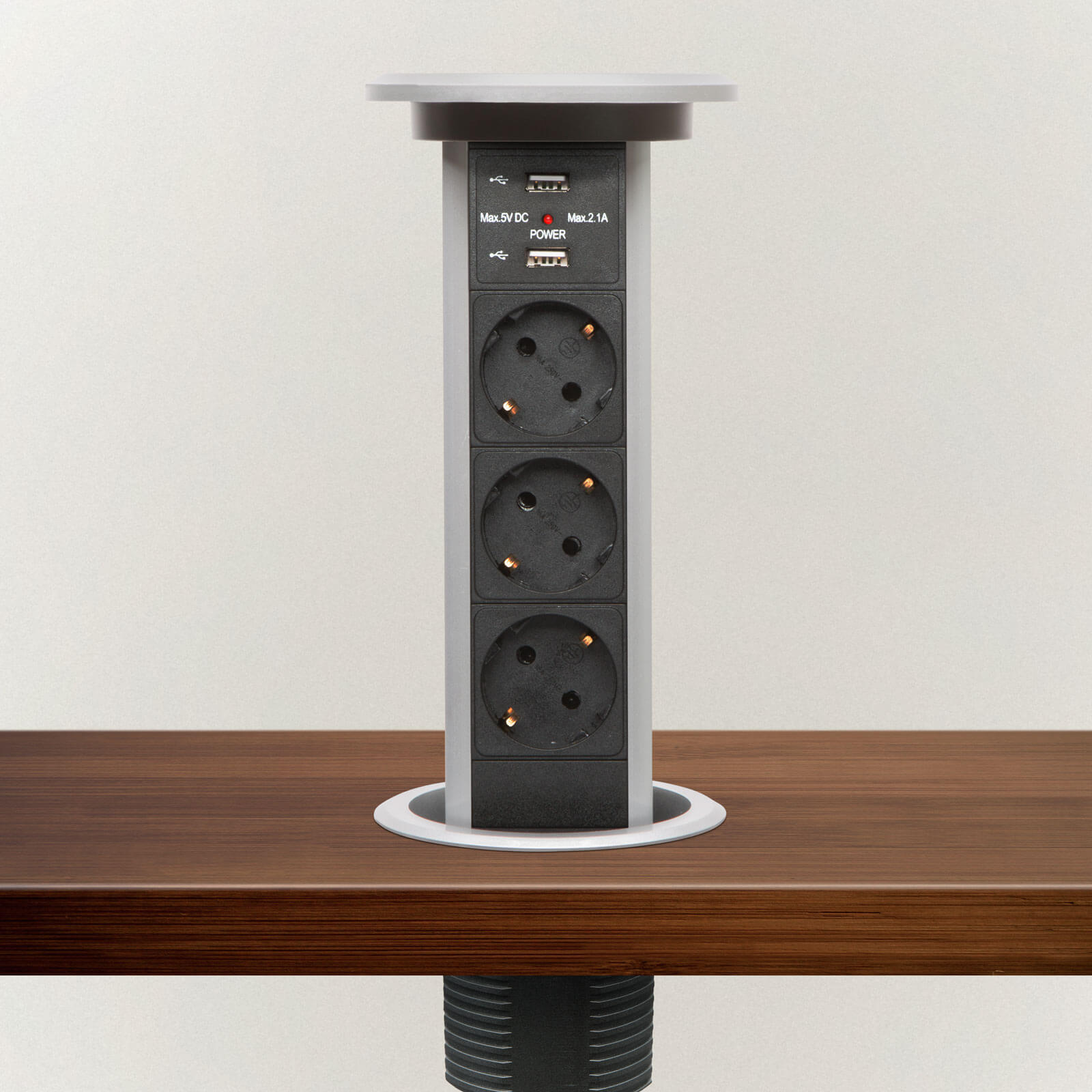 - Motorosan süllyeszthető rejtett elosztó irodai és otthoni felhasználásra, fém házzal, 3 db gyermekvédelemmel ellátott hálózati aljzattal, dupla USB töltőegységgel.