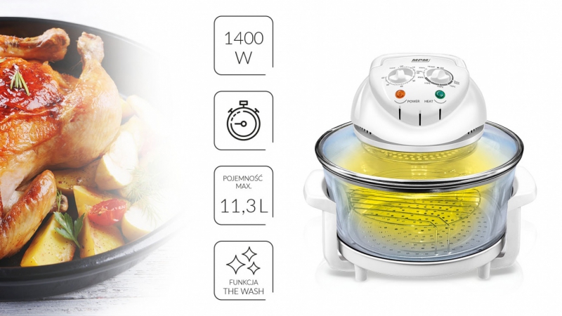 - főzés, sütés, felolvasztás és forró levegőn történő sütés, zsír hozzáadása nélkül